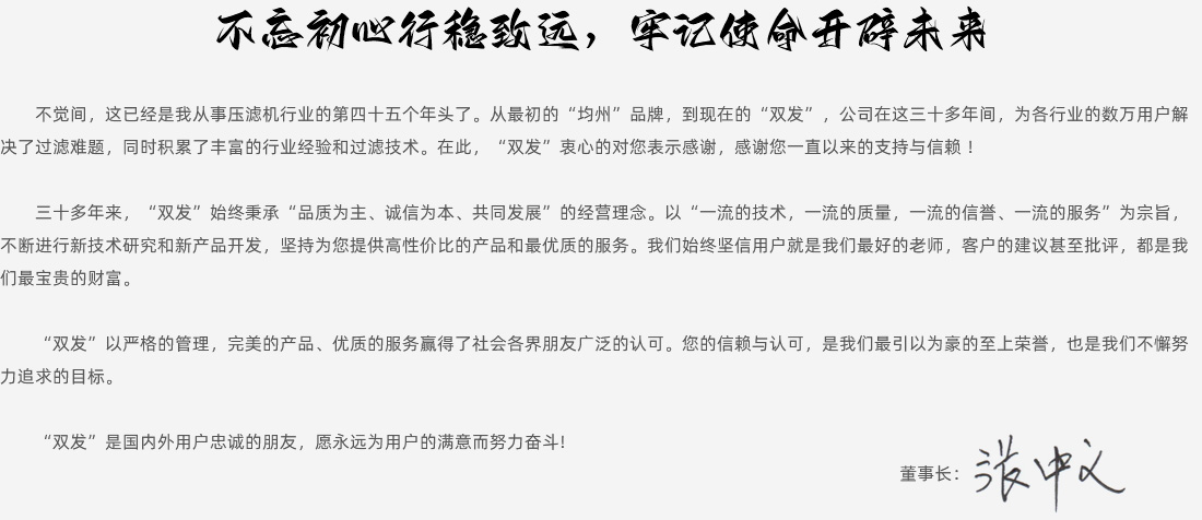 “濾污水為清泉,變污泥為凈土,還廢礦渣為青山綠地”,誠信塑品牌,質量出名牌。三十多年來,“雙發”始終秉承“品質為主、誠信為本、共同發展”的經營理念。以“一流的技術,一流的質量,一流的信譽、一流的服務”為宗旨。不斷進行新技術研究和新產品開發,堅持為用戶提供高性價比的產品和最優質的服務。